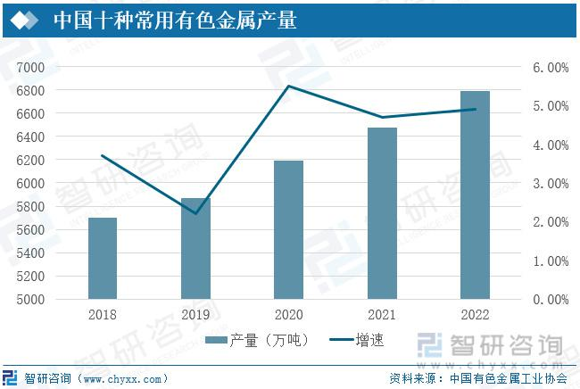 據(jù)中國(guó)有色金屬工業(yè)協(xié)會(huì)發(fā)布的數(shù)據(jù)統(tǒng)計(jì),受下端需求拉動(dòng)及消費(fèi)量增加的影響,我國(guó)十種常見(jiàn)有色金屬的產(chǎn)量呈現(xiàn)逐年增加的趨勢(shì),且增速較高。2022年十種常用有色金屬產(chǎn)量為6793.6萬(wàn)噸,較2021年同比增加4.90%。
