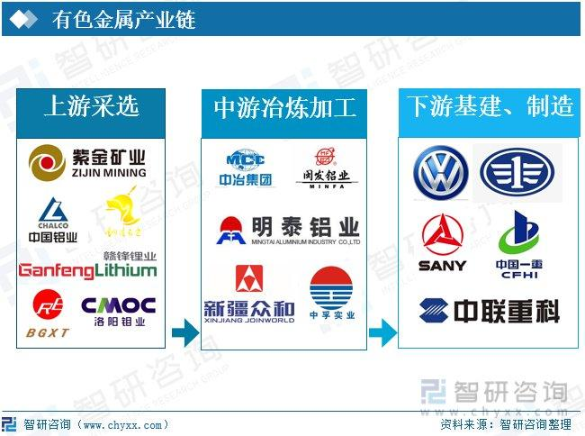 有色金屬產(chǎn)業(yè)鏈的上游主要是礦產(chǎn)資源的開(kāi)采,主要的開(kāi)采有色金屬的企業(yè)有紫金礦業(yè)、中國(guó)鋁業(yè)、銅陵有色、贛鋒鋰業(yè)等,產(chǎn)業(yè)鏈的中游主要是有色金屬的冶煉及加工,目前我國(guó)冶煉加工端一體化程度較高,主要代表企業(yè)有中冶集團(tuán)、閩發(fā)鋁業(yè)、明泰鋁業(yè)、新疆眾和等,產(chǎn)業(yè)鏈下游為基礎(chǔ)設(shè)施的建設(shè)、機(jī)械制造等,主要的代表企業(yè)有中國(guó)一汽、上海大眾、三一重工等。