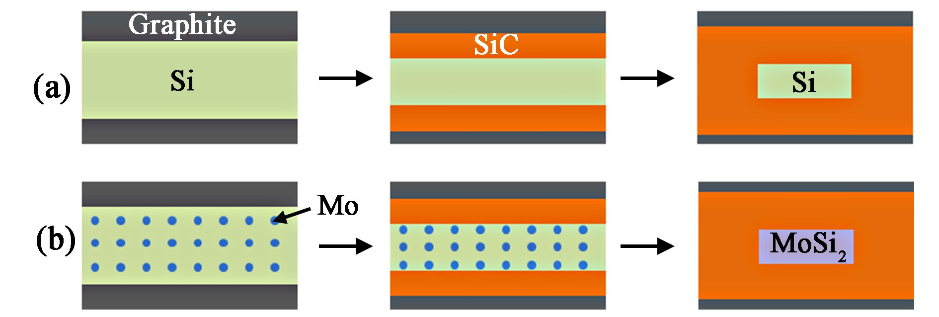 由于石墨具有耐高溫的特點(diǎn),常被用作高溫密封材料。 采用熔融滲硅的工藝可以實(shí)現(xiàn)孔隙率的顯著降低,但自由硅的存在制約了其在高溫密封場(chǎng)景下的應(yīng)用。 由于鉬可以與硅反應(yīng)生成二硅化鉬,從而降低自由硅的含量,并且二硅化鉬本身具有高熔點(diǎn)及抗氧化的特點(diǎn),因此適合作為熔滲反應(yīng)時(shí)的添加成分。 本文采用硅粉中加入二硅化鉬粉體的方法降低熔滲后樣品中的自由硅含量,研究鉬元素的引入對(duì)熔滲后試樣微觀形貌、組成及力學(xué)性能的影響,并提出對(duì)熔滲機(jī)制的影響。