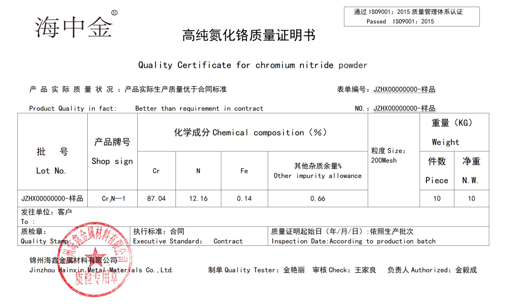 煉鋼添加劑:氮化鉻可部分替代鎳在不銹鋼中的作用,降低生產(chǎn)成本,但無法完全取代鎳的耐腐蝕性能。高溫結(jié)構(gòu)材料:用于耐高溫合金,如航空發(fā)動機部件,因其熔點高達1650℃且在高溫下穩(wěn)定性優(yōu)異。