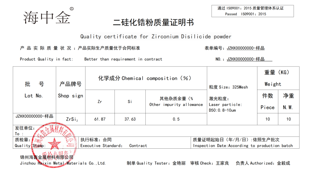 產(chǎn)品名稱:二硅化鋯(ZrSi2)